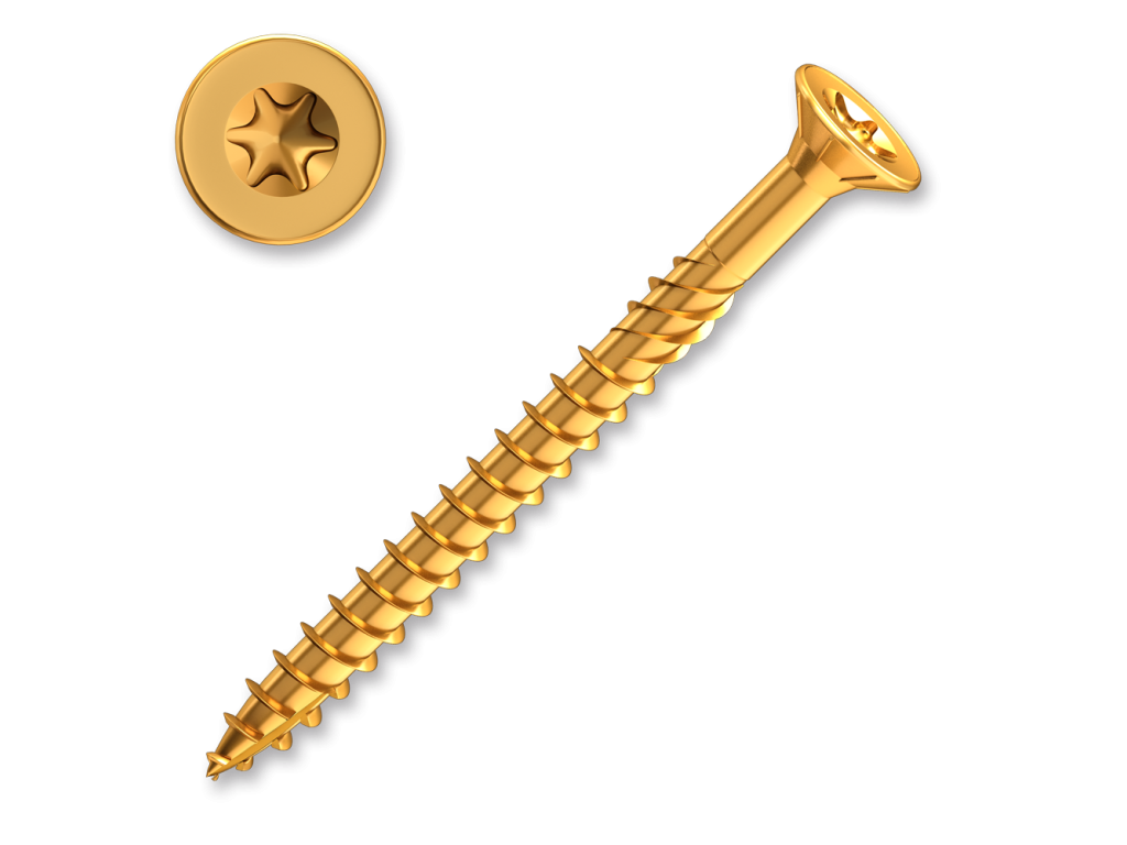 Konstrukční vruty se zápustnou hlavou a drážkou Torx Tyto stavební tesařské vruty se zápustnou hlavou se vyznačují vysokou pevností díky použitému materiálu s vyšším obsahem uhlíku a následnému tepelnému zušlechtění - kalení. Konstrukční vrut je opatřen na povrchu kluzným lakem, čímž se snižuje tření při zavrtávání do materiálu. Další předností stavebního vrutu je jeho speciální řezná špička a dvouchodý závit, které umožňují snadné zavrtání i do tvrdšího dřeva bez předchozího předvrtání. Frézovací drážky pod zápustnou hlavou usnadňují zapuštění vrutu do materiálu. Tesařské vruty dodáváme galvanicky pozinkované. Široký sortiment vrutů nabízíme v zinku žlutém zinku a v bílém zinku.Doplňkové parametry