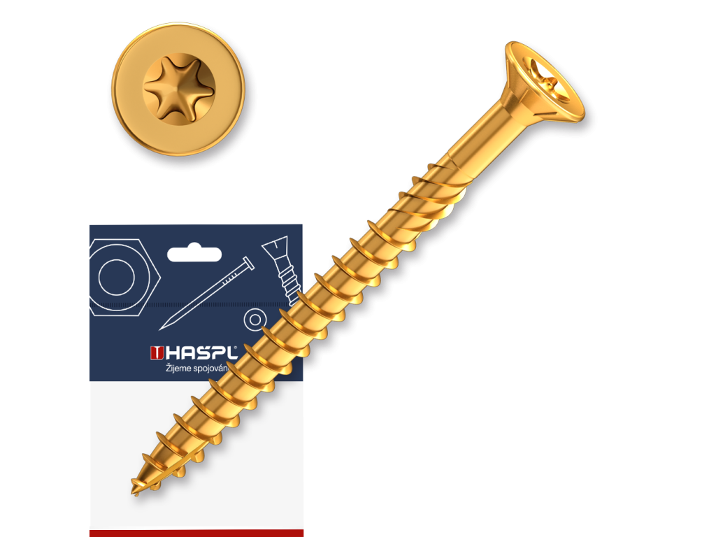 Konstrukční vrut 4 x 45 se zápustnou hlavou a drážkou Torx Tyto stavební tesařské vruty se zápustnou hlavou se vyznačují vysokou pevností díky použitému materiálu s vyšším obsahem uhlíku a následnému tepelnému zušlechtění - kalení. Konstrukční vrut je opatřen na povrchu kluzným lakem, čímž se snižuje tření při zavrtávání do materiálu. Další předností stavebního vrutu je jeho speciální řezná špička a dvouchodý závit, které umožňují snadné zavrtání i do tvrdšího dřeva bez předchozího předvrtání. Frézovací drážky pod zápustnou hlavou usnadňují zapuštění vrutu do materiálu. Tesařské vruty dodáváme galvanicky pozinkované. Široký sortiment vrutů nabízíme v zinku žlutém zinku a v bílém zinku.Doplňkové parametry