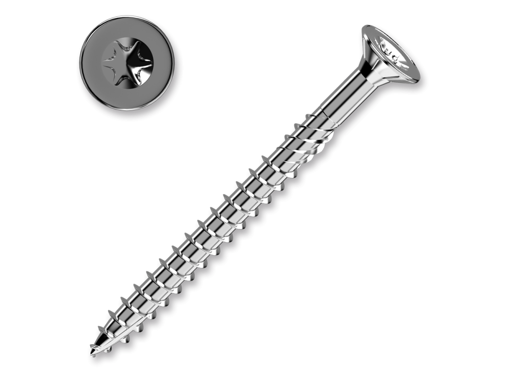 Konstrukční vruty se zápustnou hlavou a drážkou Torx Tyto stavební tesařské vruty se zápustnou hlavou se vyznačují vysokou pevností díky použitému materiálu s vyšším obsahem uhlíku a následnému tepelnému zušlechtění - kalení. Konstrukční vrut je opatřen na povrchu kluzným lakem, čímž se snižuje tření při zavrtávání do materiálu. Další předností stavebního vrutu je jeho speciální řezná špička a dvouchodý závit, které umožňují snadné zavrtání i do tvrdšího dřeva bez předchozího předvrtání. Frézovací drážky pod zápustnou hlavou usnadňují zapuštění vrutu do materiálu. Tesařské vruty dodáváme galvanicky pozinkované. Široký sortiment vrutů nabízíme v zinku žlutém zinku a v bílém zinku.Doplňkové parametry