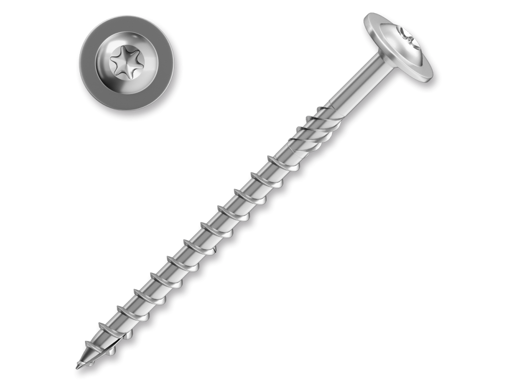Konstrukční vruty s talířovou hlavou a drážkou Torx Tyto stavební tesařské vruty s talířovou hlavou se vyznačují vysokou pevností díky použitému materiálu s vyšším obsahem uhlíku a následnému tepelnému zušlechtění. Konstrukční vrut je opatřen na povrchu kluzným lakem, čímž se snižuje tření při zavrtávání do materiálu. Další předností stavebního vrutu je jeho speciální řezná špička a dvouchodý závit, které umožňují snadné zavrtání i do tvrdšího dřeva bez předchozího předvrtání. Větší plocha talířové hlavy umožňuje vyšší svěrnou sílu, nedochází k průchodu hlavy spojovaným materiálem. Tesařské vruty dodáváme galvanicky pozinkované. Široký sortiment vrutů nabízíme v zinku žlutém a v zinku bílém.Doplňkové parametry