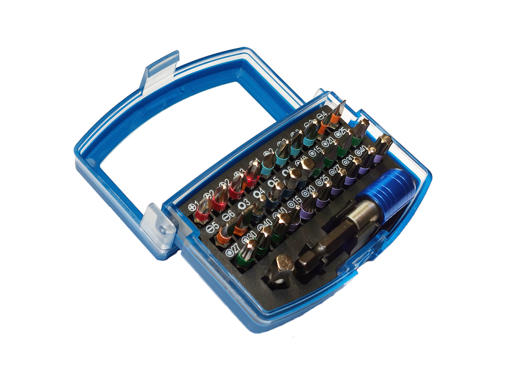 Univerzální sada šroubovacích bitů obsahuje 32 dílů z kvalitní chromvanadové oceli (jakosti S2) a je navržena pro dlouhodobou životnost a široké využití s různými značkami elektrického nářadí. Díky barevnému kódování je výběr bitů snadný a rychlý. Sada zahrnuje bity o délce 25 mm, magnetický držák, adaptér pro nástrčkové klíče a praktický robustní box s klipsnou na opasek. Vše je uloženo přehledně a navrženo tak, aby zajistilo maximální spokojenost a pohodlí při práci. Sada obsahuje: S2-Bity délka= 25 mm: 1x PH1, 2x PH2, 1x PH3 (křízový PHILLIPS) 1x PZ1, 2x PZ2, 1x PZ3 (křížový POZIDRIV) 1x SL3, 1x SL4, 1x SL5, 1x SL6 (PLOCHÝ) 1x H3, 1x H4, 1x H5, 1x H6 (šestihran 'IMBUS') 1x T10, T15, T20, T25, T27, T30, T40 (hvězdička TORX) 1x T10, T15, T20, T25, T27, T30, T40 (hvězdička TORX s otvorem) 1x Magnetický držák bitů 65 mm 1x Adaptér se čtyřhranem na 1/4' na hlaviceDoplňkové parametry